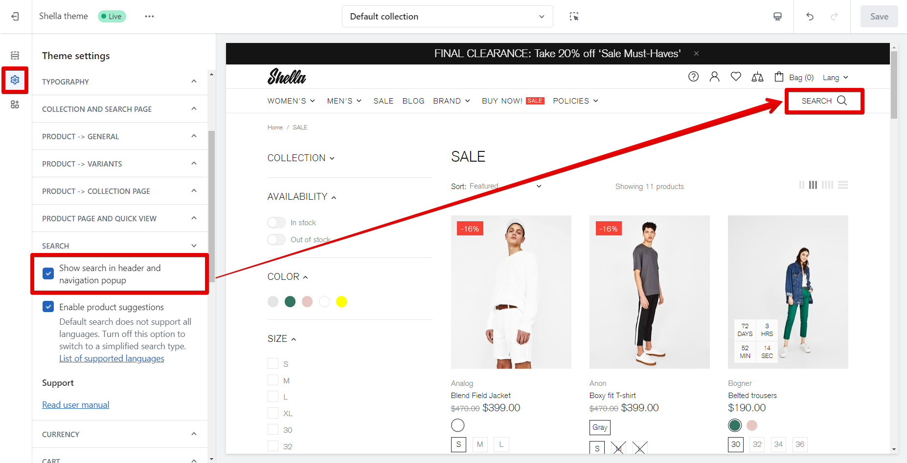 **Theme settings -> Search**