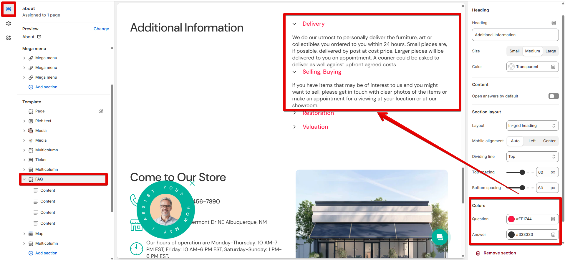 Change the title and description text colors in the collapsible tabs using the **"Question"** and **"Answer"** pickers: