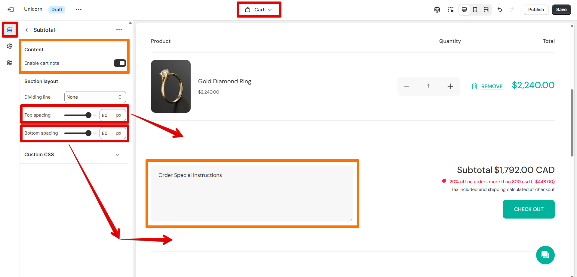 The **"Top spacing"** option controls the space between the breadcrumbs or Header (if the breadcrumbs are disabled) and the "Subtotal" section. Use the scale from 0 to 100 pixels to set the desired parameter.