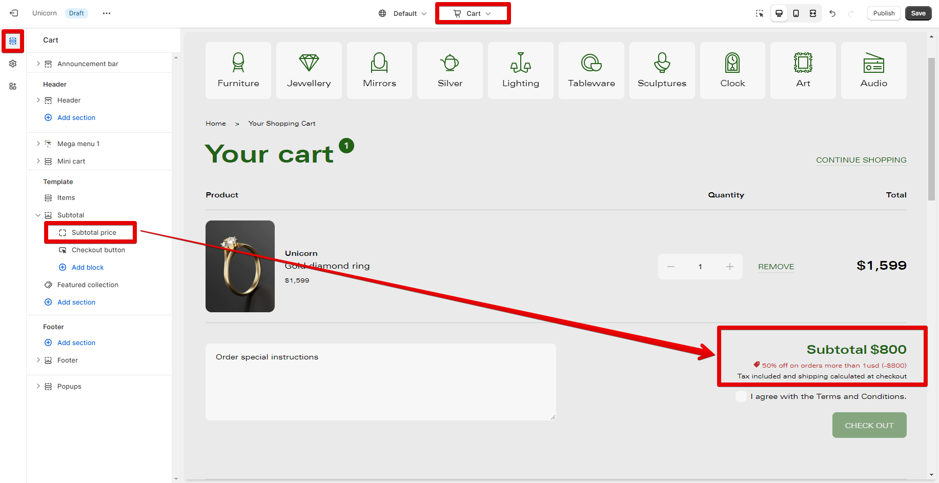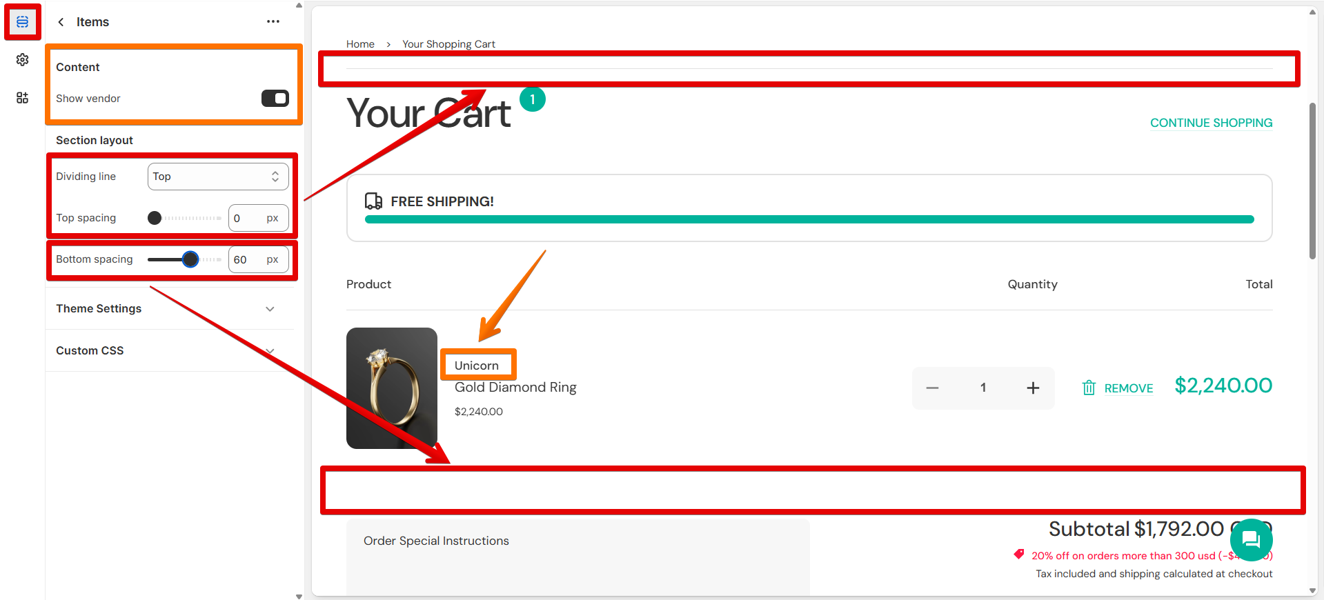 The theme includes two static sections that help to change the look and feel of the Cart page: **"Items"** and **"Subtotal"**.