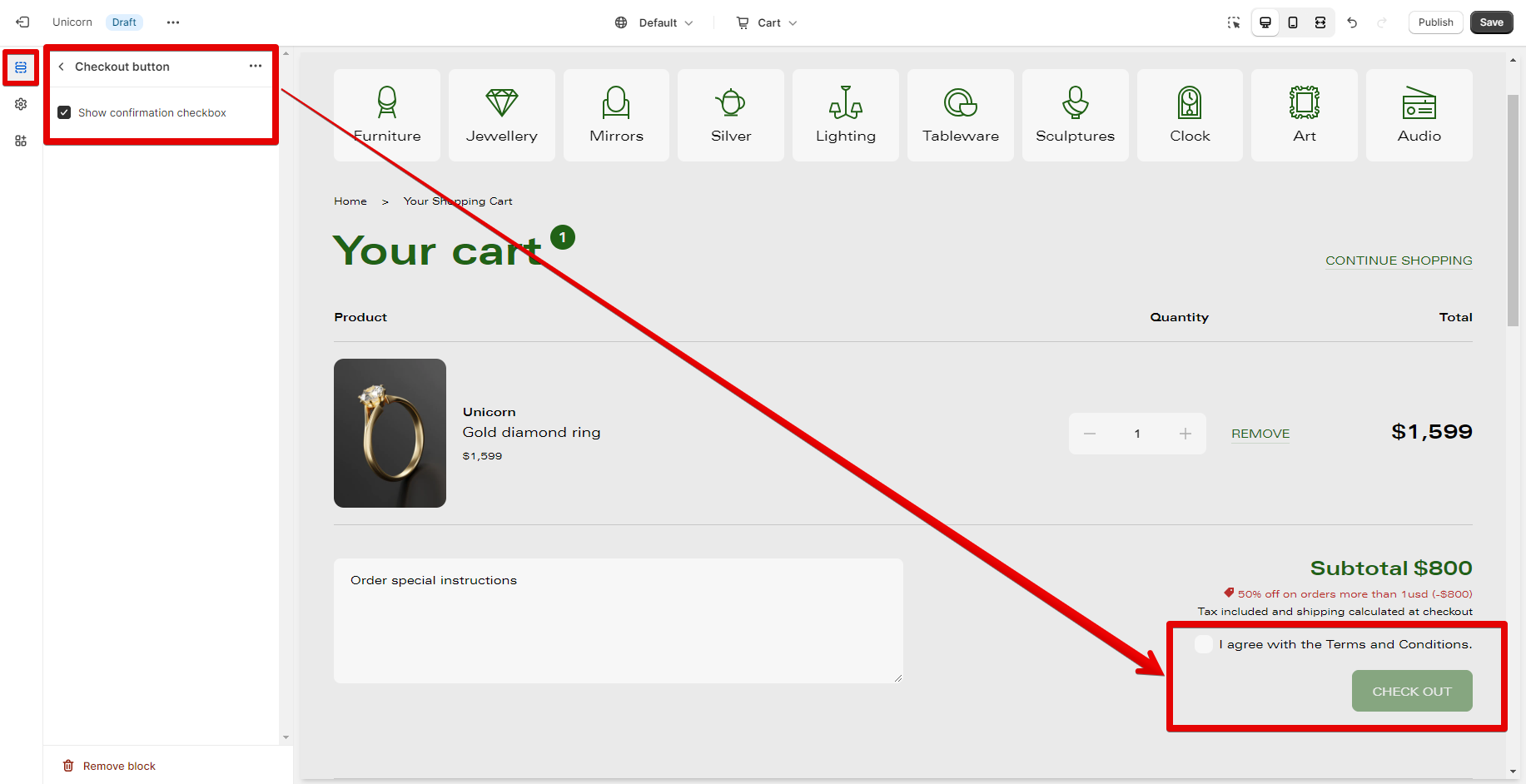 Using the option **"Show confirmation checkbox"** allows adding the terms of use checkbox that should be accepted before proceeding to the checkout page: