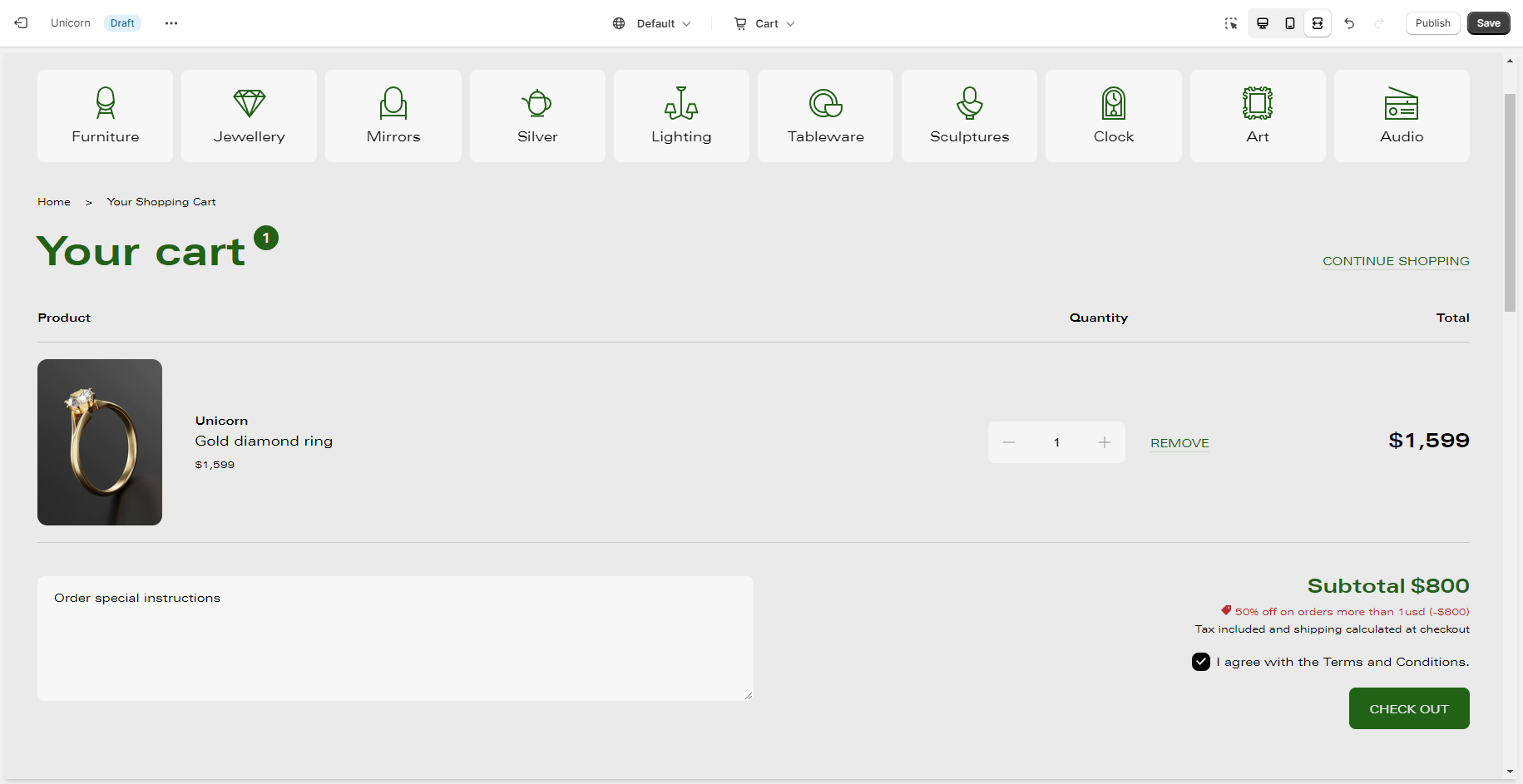 In the following examples, you can see how the Cart page might look on desktop and mobile: