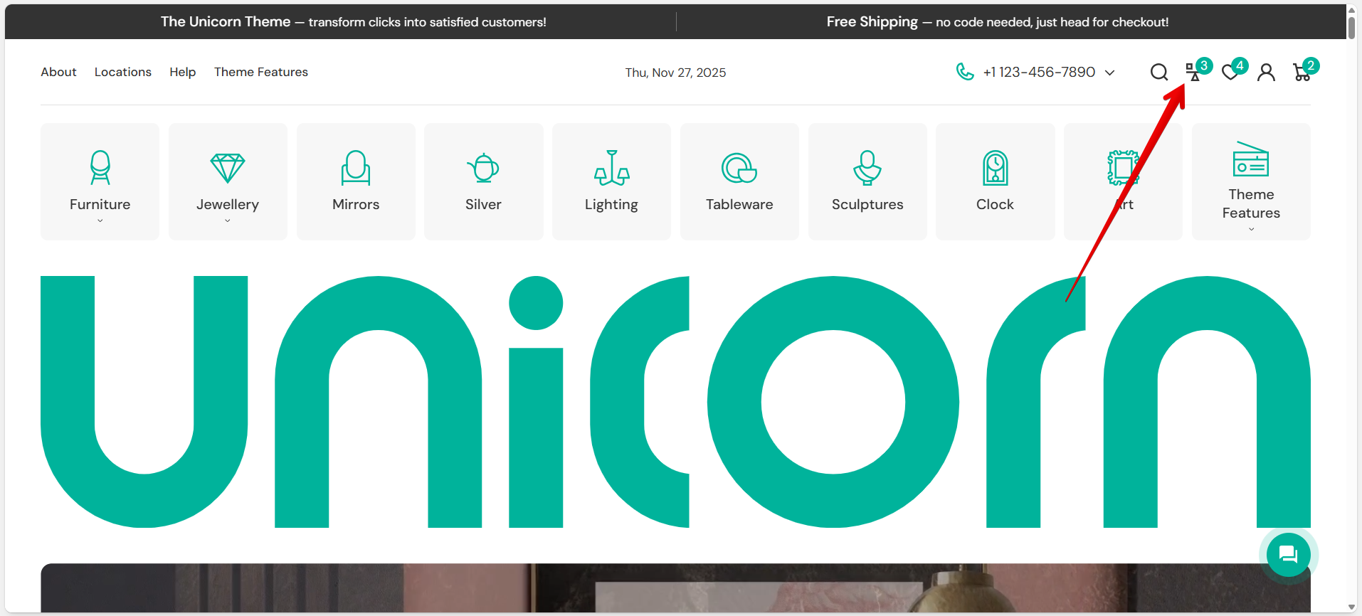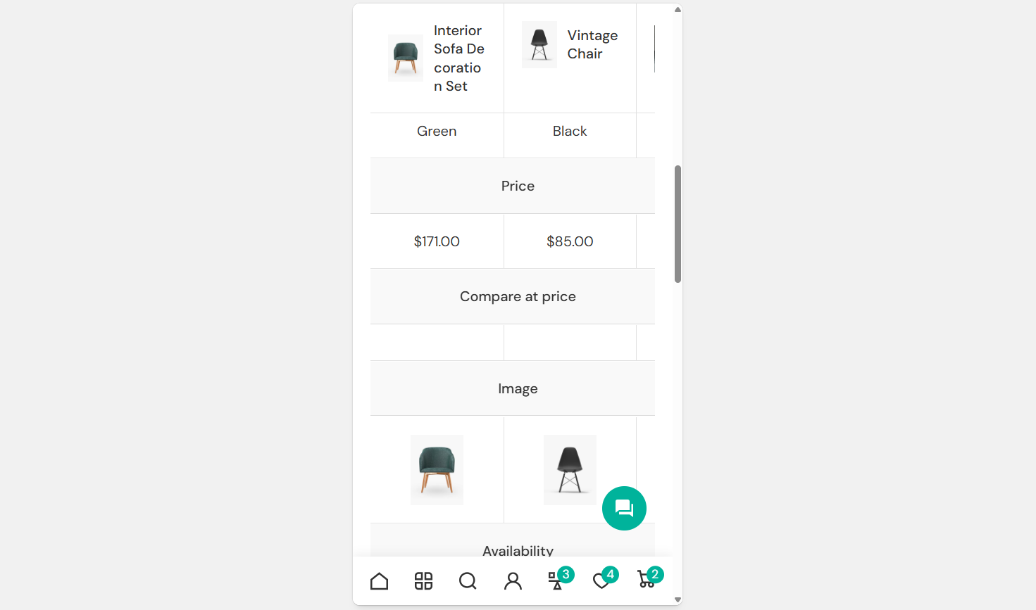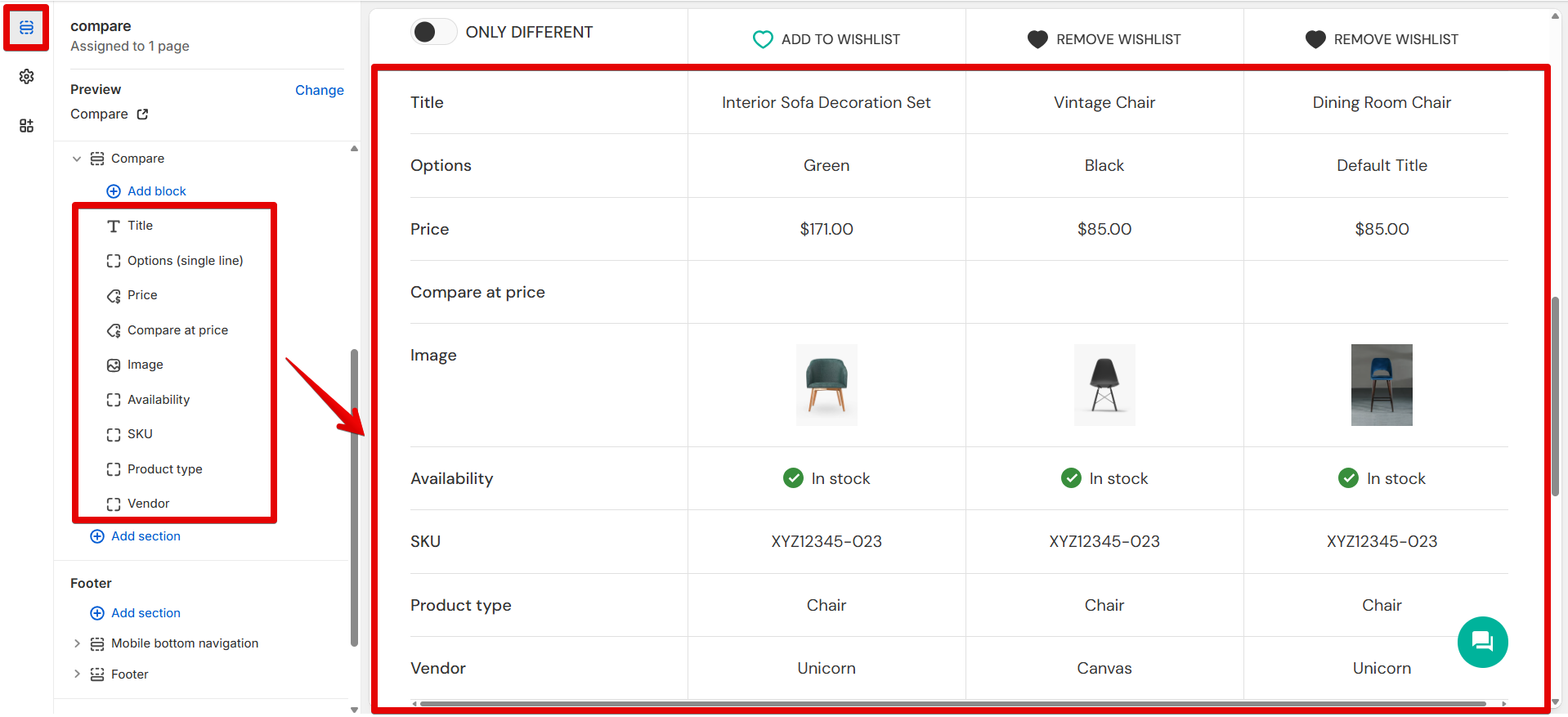 2\. The Compare page can be viewed after pressing the compare icon in the Header. Activate the icon in *Theme settings -> Favorites & Compare ->* [*<mark style="color:blue;">Compare</mark>*](https://mpithemes.gitbook.io/unicorn-shopify-theme/theme-settings/favorites-and-compare#compare).