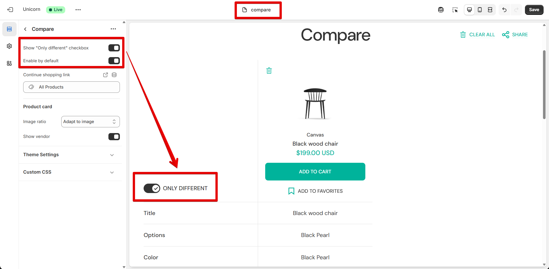 Activate the **"Show "Only different" checkbox"** option to display the corresponding button in the comparison table. The enabled checkbox hides details about products that are similar for all of them.