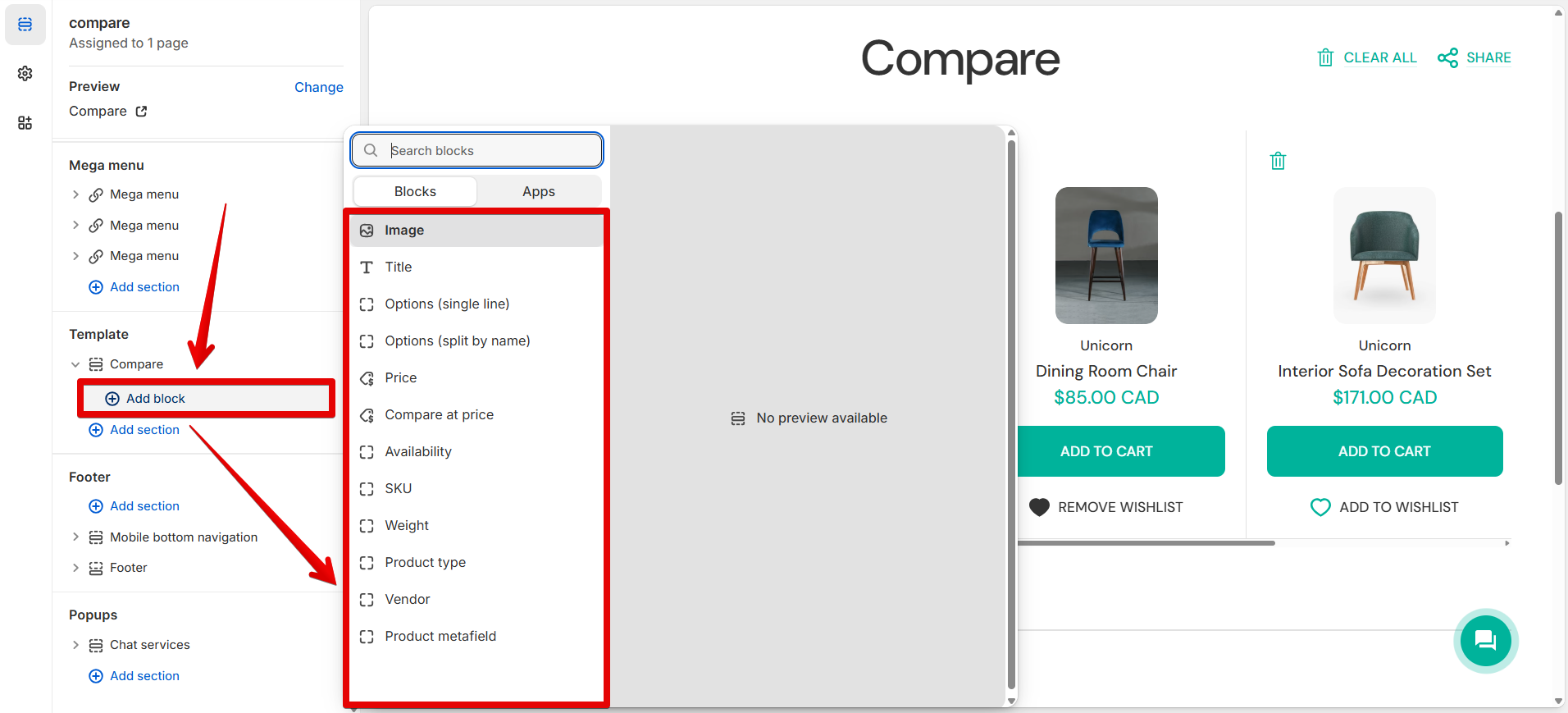 **Tip:** To add a block, press **"Add block"** in the **"Compare"** section and select one from the list.