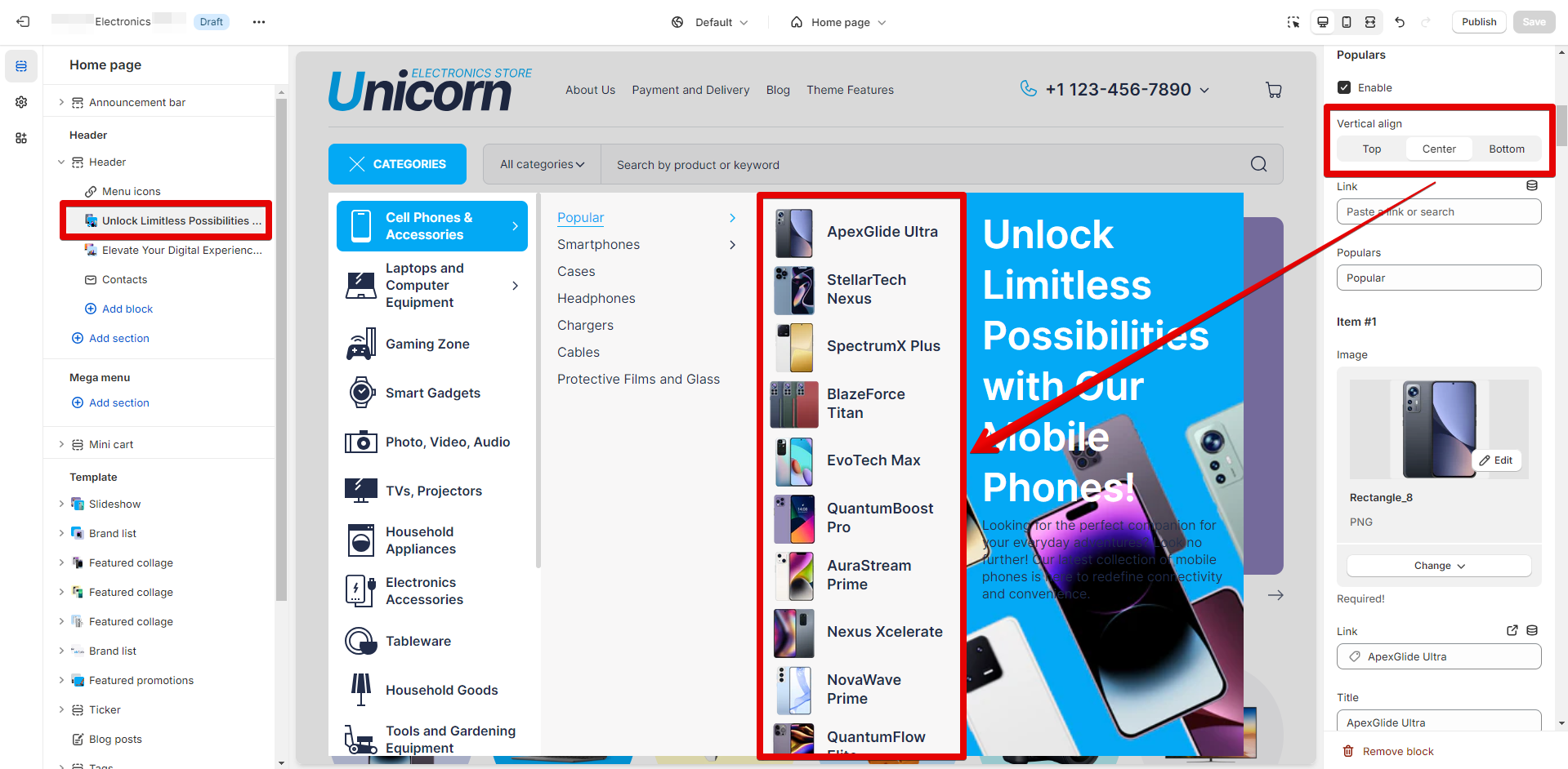 With the provided settings, you can incorporate an extra column on the side featuring images with text, which can be linked to pre-defined collections. The items will appear as the nested menu of the **"Populars"** item. Disabling the [<mark style="color:blue;">option</mark>](#populars) will hide the items column by default.