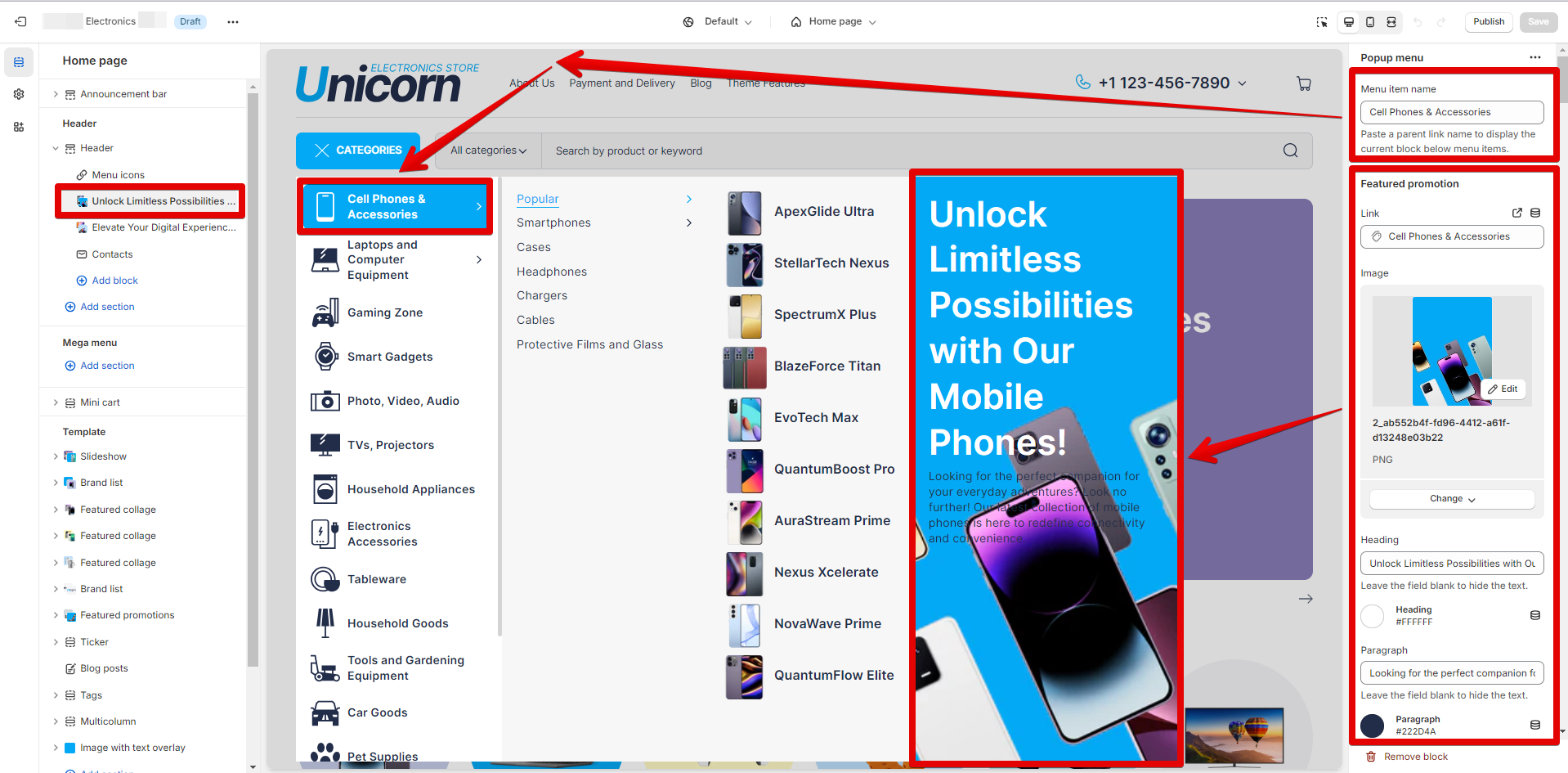 **Tip:** To add a block, press **"Add block"** and choose **"Popup menu"** from the proposed list of blocks. This block can be added multiple times for each parent menu item.