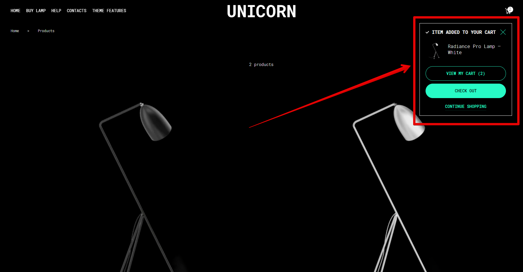 \*Once the "[<mark style="color:blue;">Cart drawer</mark>](https://mpithemes.gitbook.io/unicorn-shopify-theme/section-groups/cart-drawer)" section has been added, the theme will respond by opening the Cart drawer.