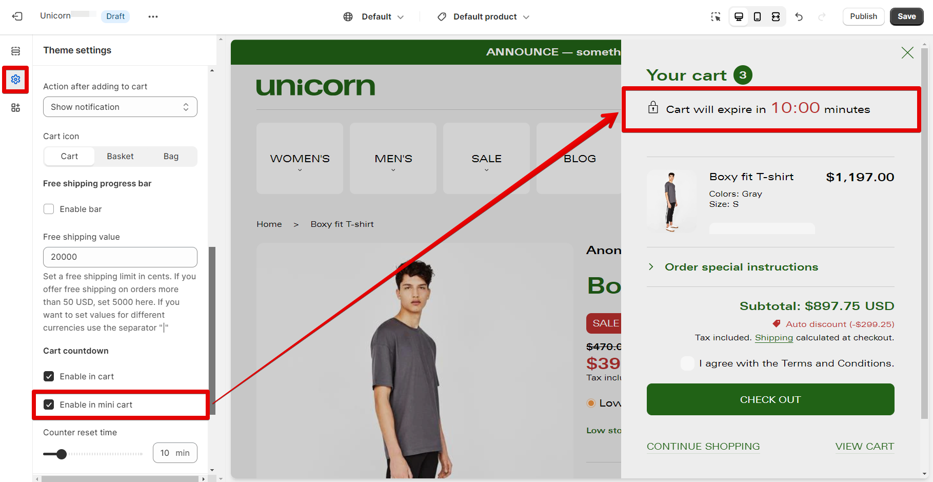 Once checked, a countdown timer will be added to the top of the Cart drawer to indicate when the items are added to the Cart. The "Counter reset time" will appear below after enabling the current option.