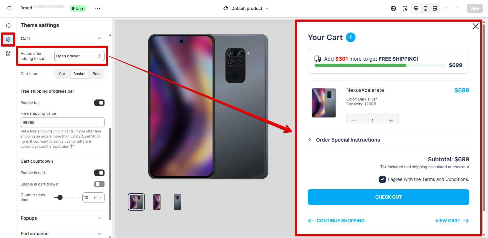 * **"Open drawer"**. This option lets you display a list of items in the cart drawer as a customer adds each following product to the cart.