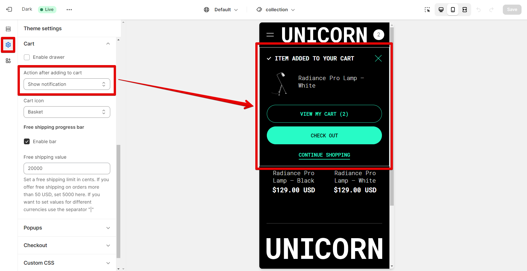 **Note!** To use the option, add the "[<mark style="color:blue;">Cart drawer</mark>](https://mpithemes.gitbook.io/unicorn-shopify-theme/section-groups/cart-drawer)" section and apply the settings provided within the section.