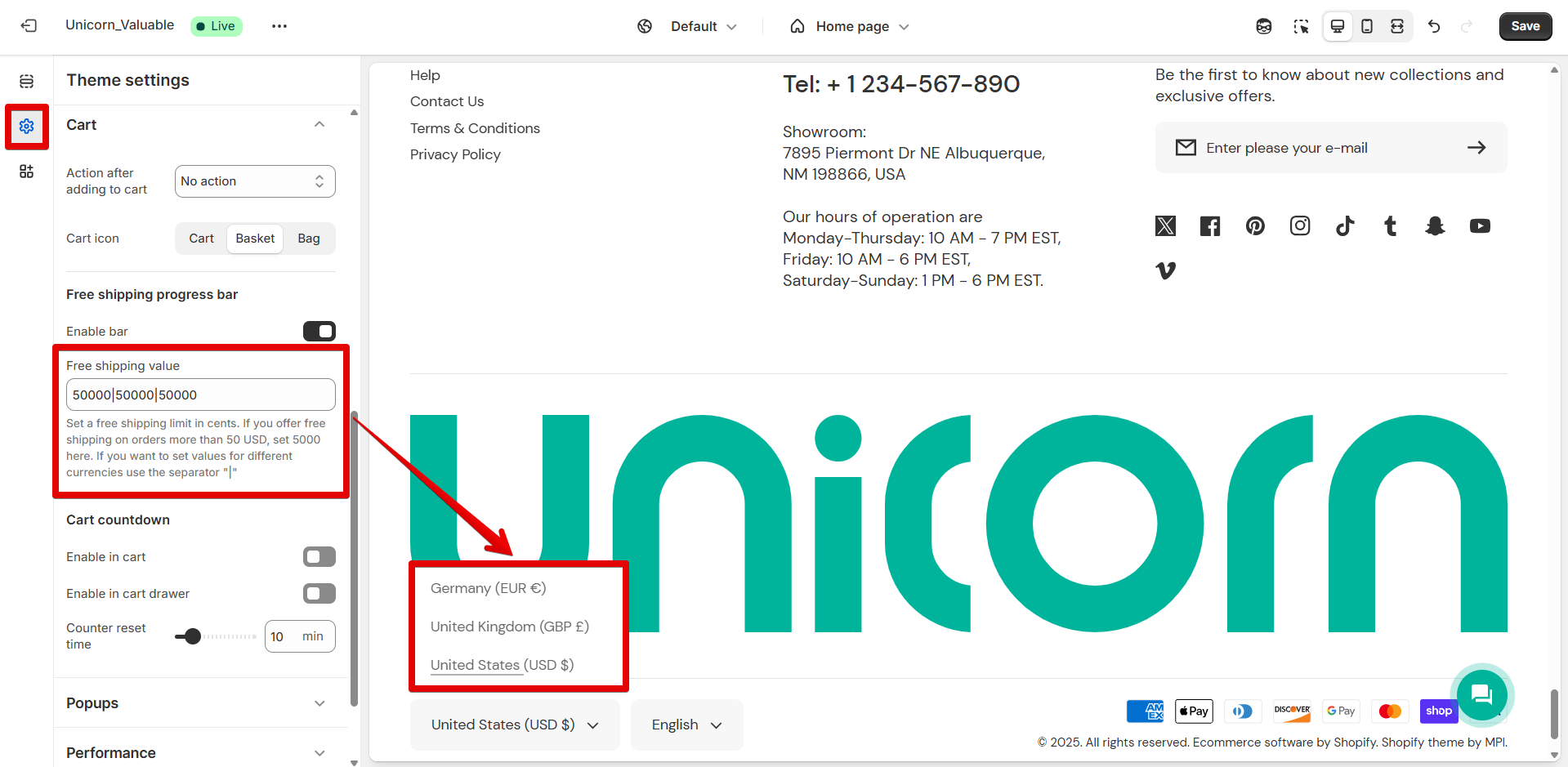 In the **"Free shipping value"** input field, enter the free shipping limit in the format 1 USD = 100 cents.