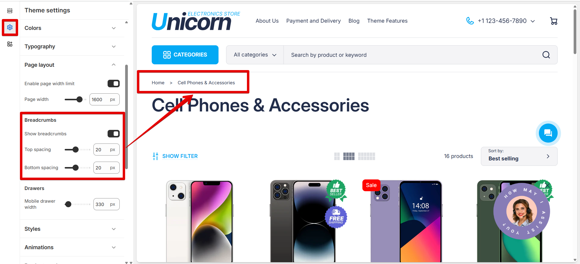 Control the top and bottom spacing of the breadcrumbs using the corresponding sliders from 0 to 50 pixels.