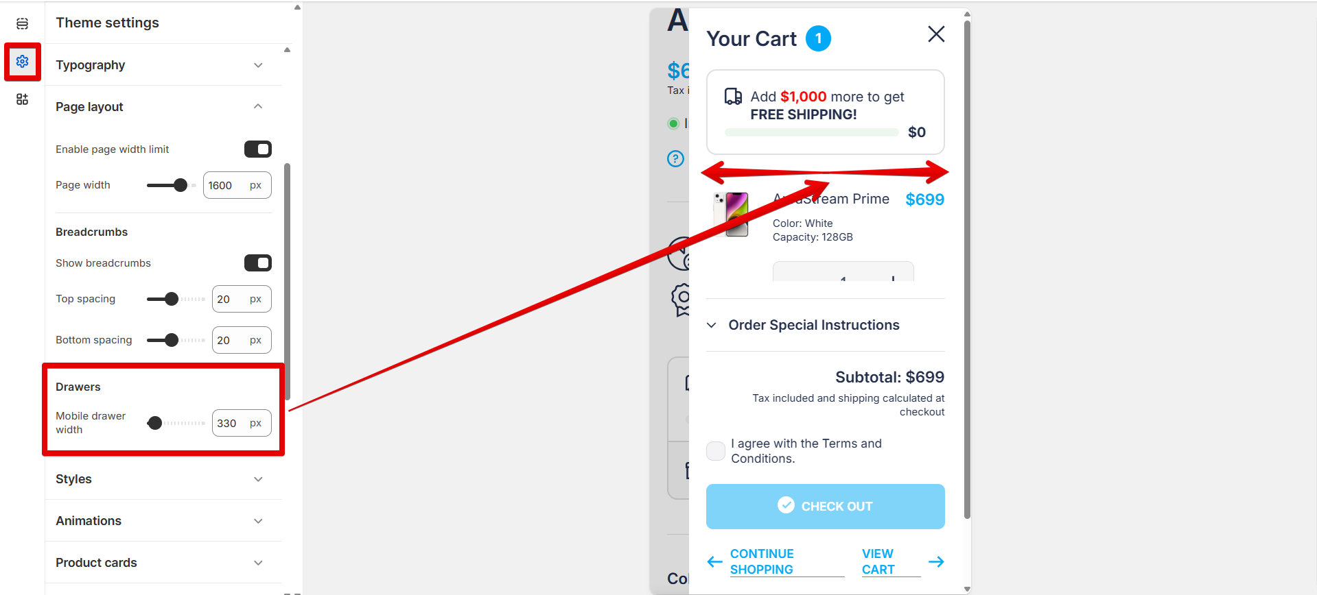 Change the Cart drawer's appearance on mobile devices by specifying its width from 320 to 580 pixels using the provided scale.