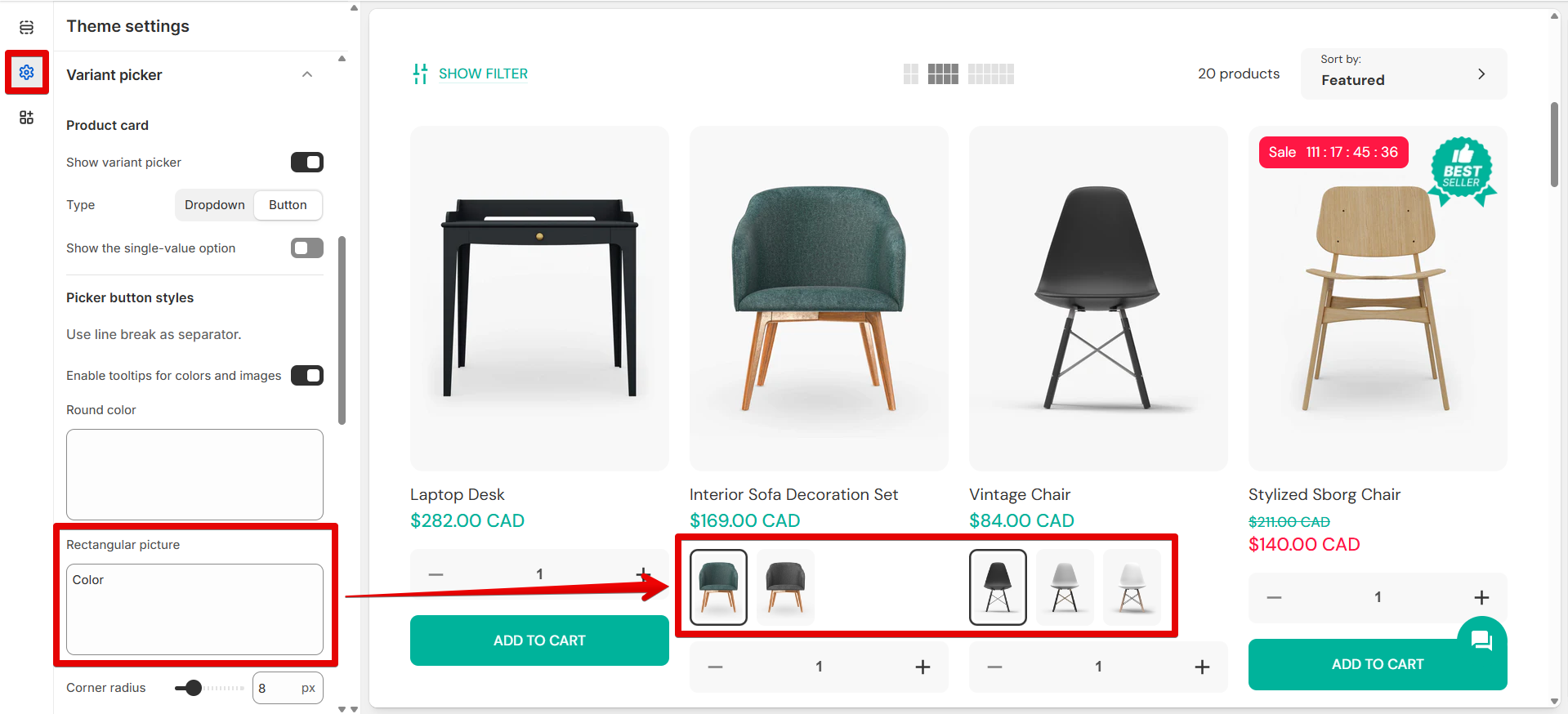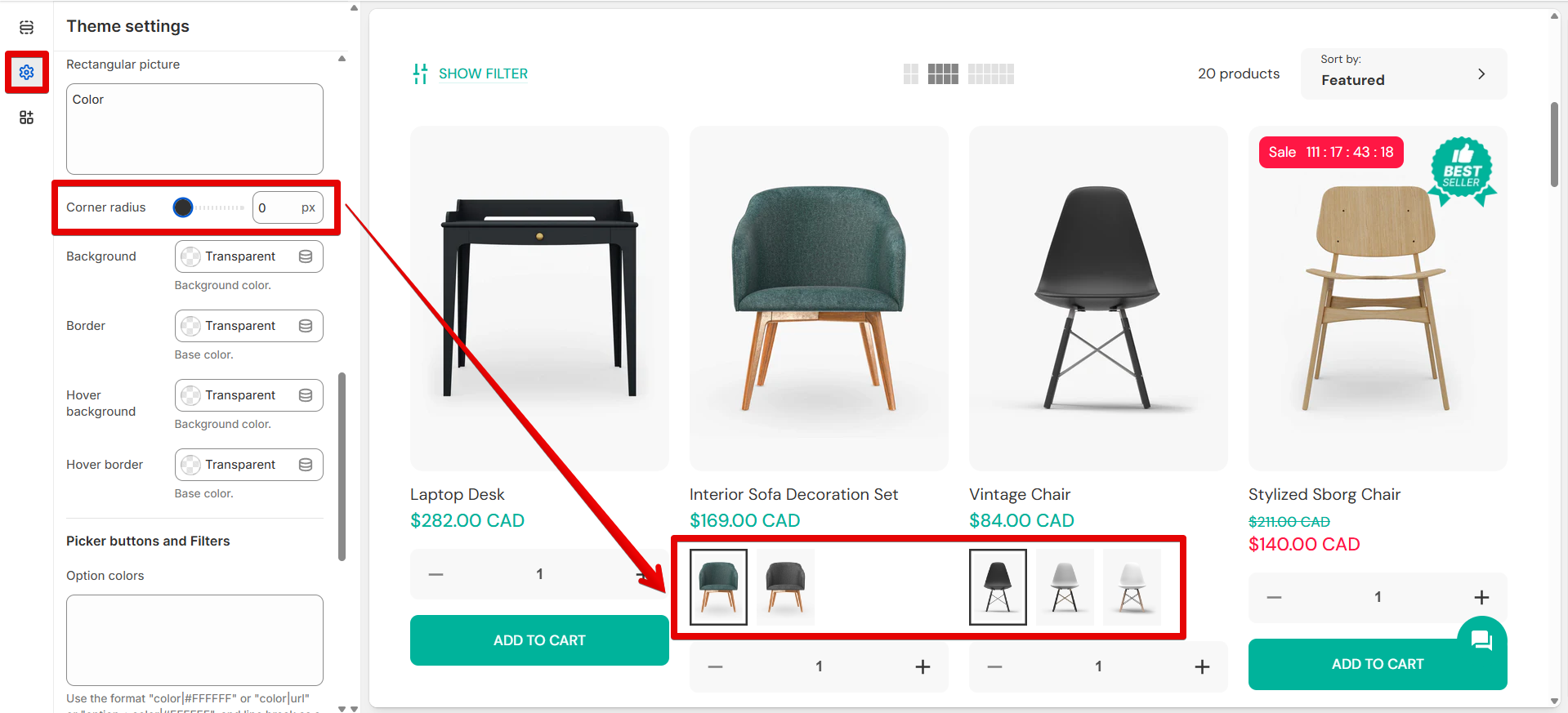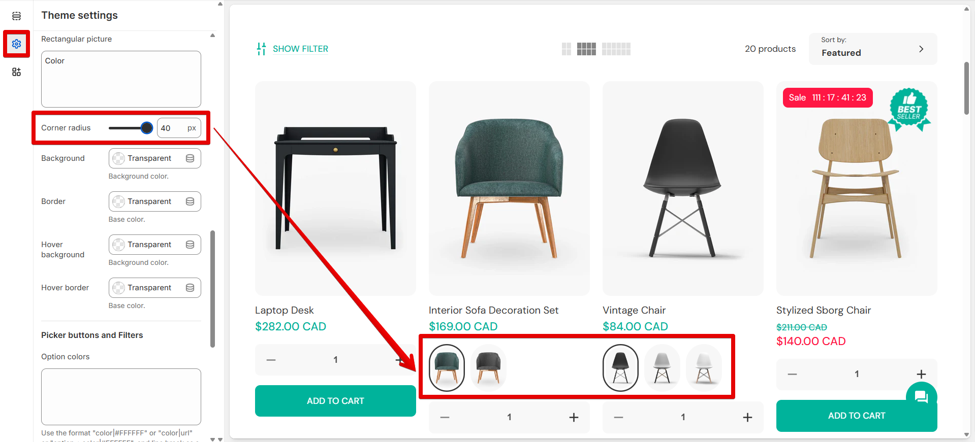 The corner angles of product variants can be adjusted on a scale of 0 to 40 pixels, where a value of 0 displays variants as squares, while 40 pixels renders them as ellipses.