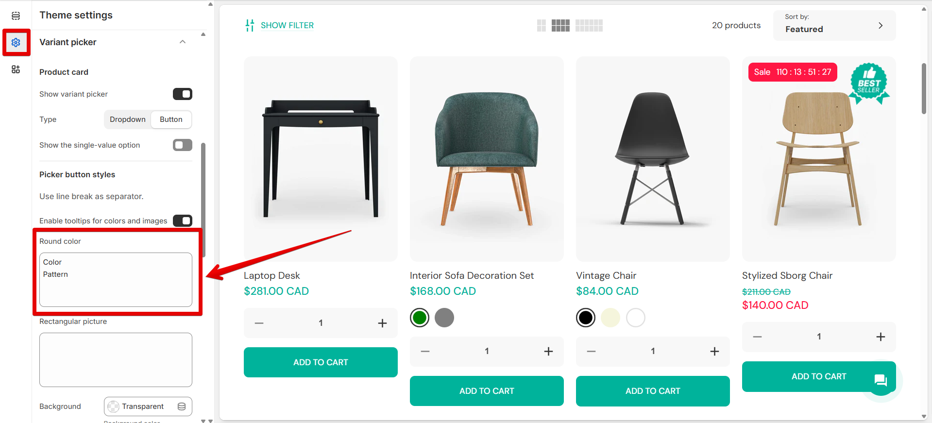 Apply the **"Background"** color to change the base color of the text variant pickers, such as "Size".