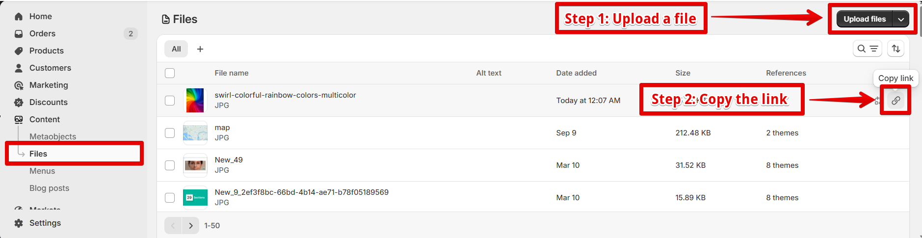 Go to your *Shopify admin -> Content -> Files* and upload a new file.