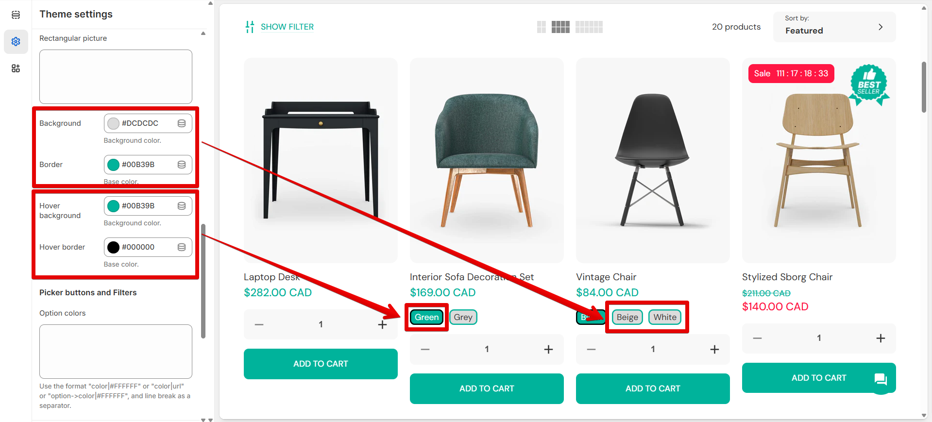 Use the **"Hover background"** and **"Hover border"** items to change the colors of the selected product variant, as well as the product variants that are hovered over with the mouse.