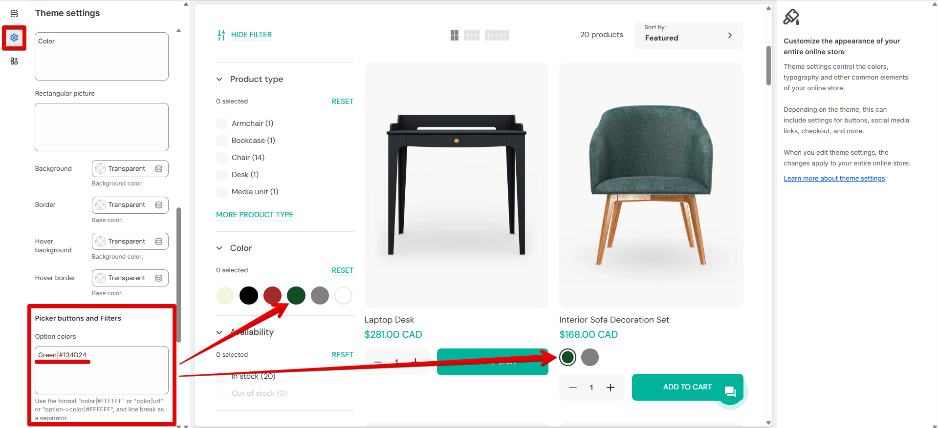 Paste the product option name (for example, "Color") into the input field to change the style of product variants to rectangular colors or images: