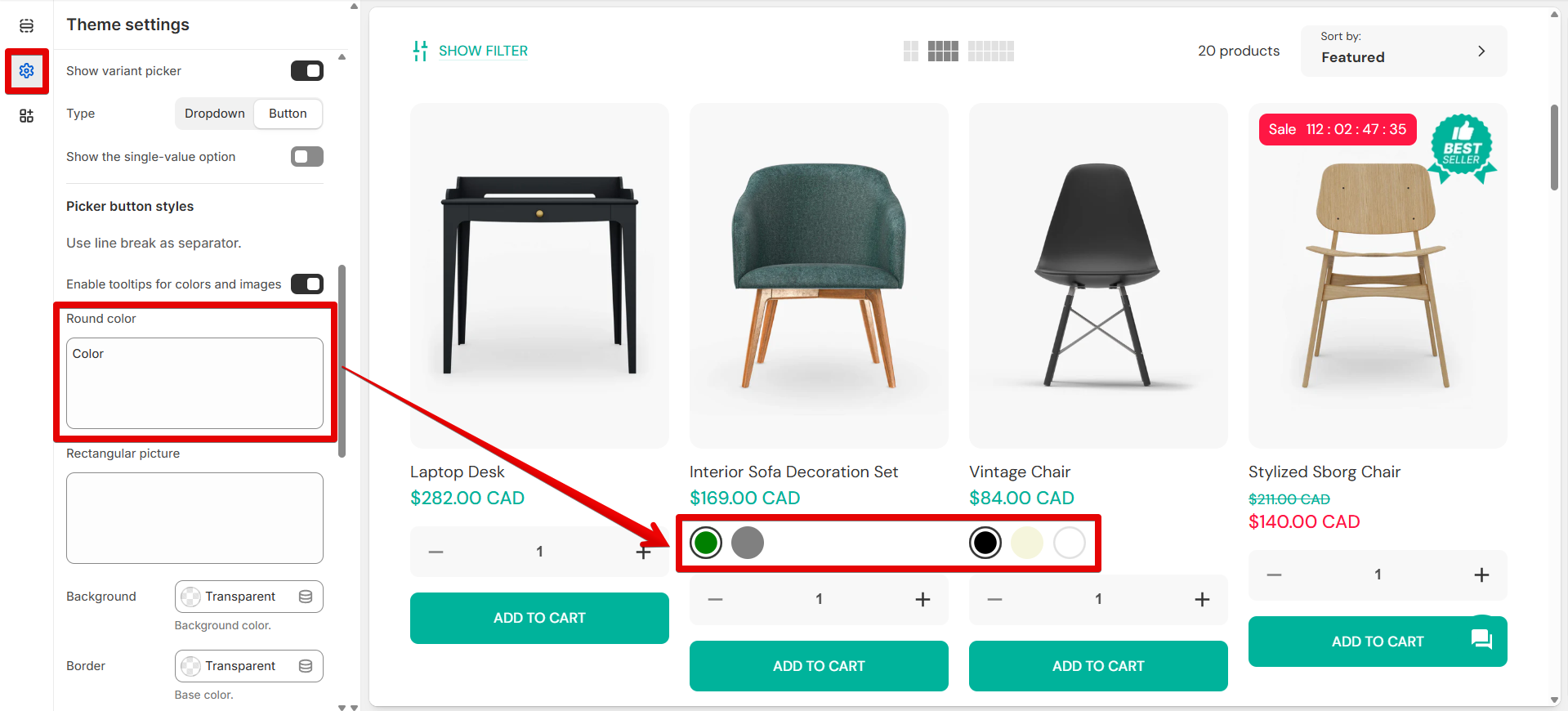 **Tip:** To display the settings that apply to "Option colors" for product variants, enter the product option name into the "[<mark style="color:blue;">Round color</mark>](#round-color)" input field.