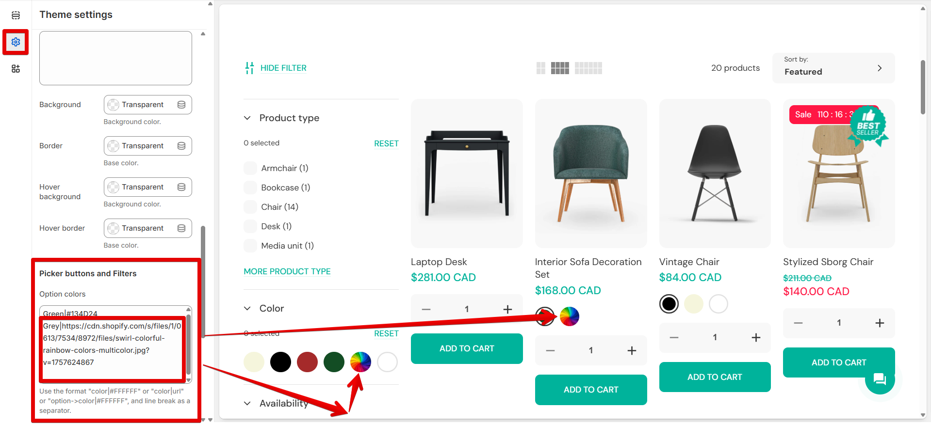 To set the desired colors or images for filter items and product variants, you can use such values: