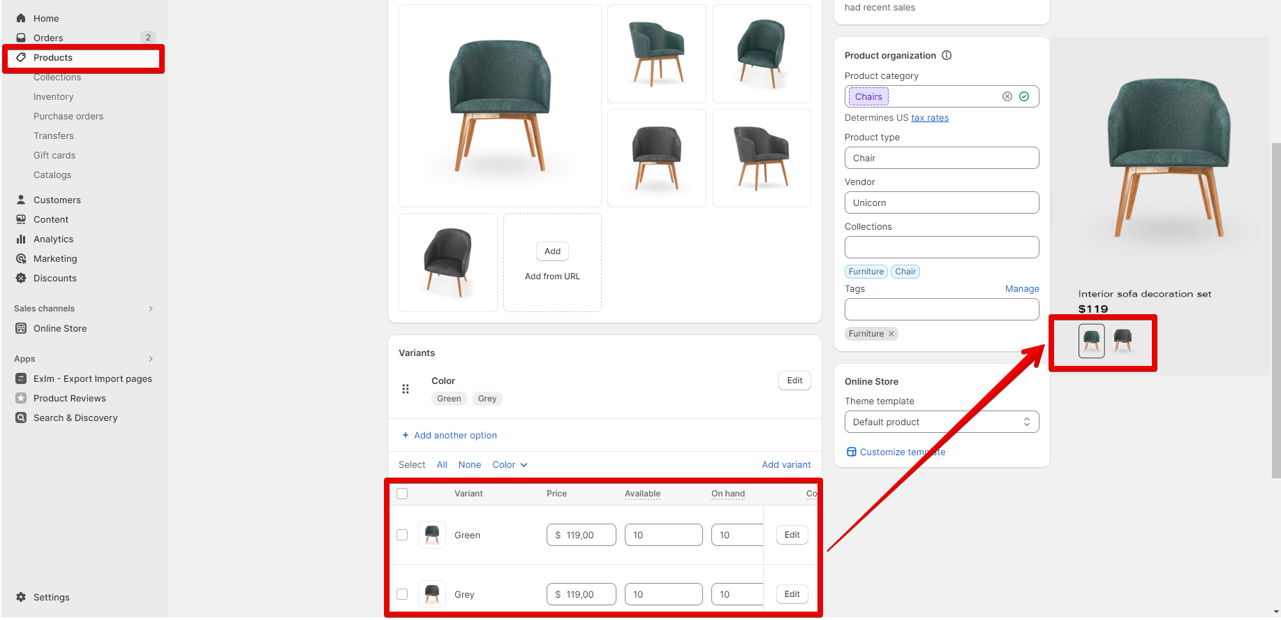 **Tip:** To display the color variants as images instead of the color options, assign a corresponding product image for each product variant in your Shopify admin: